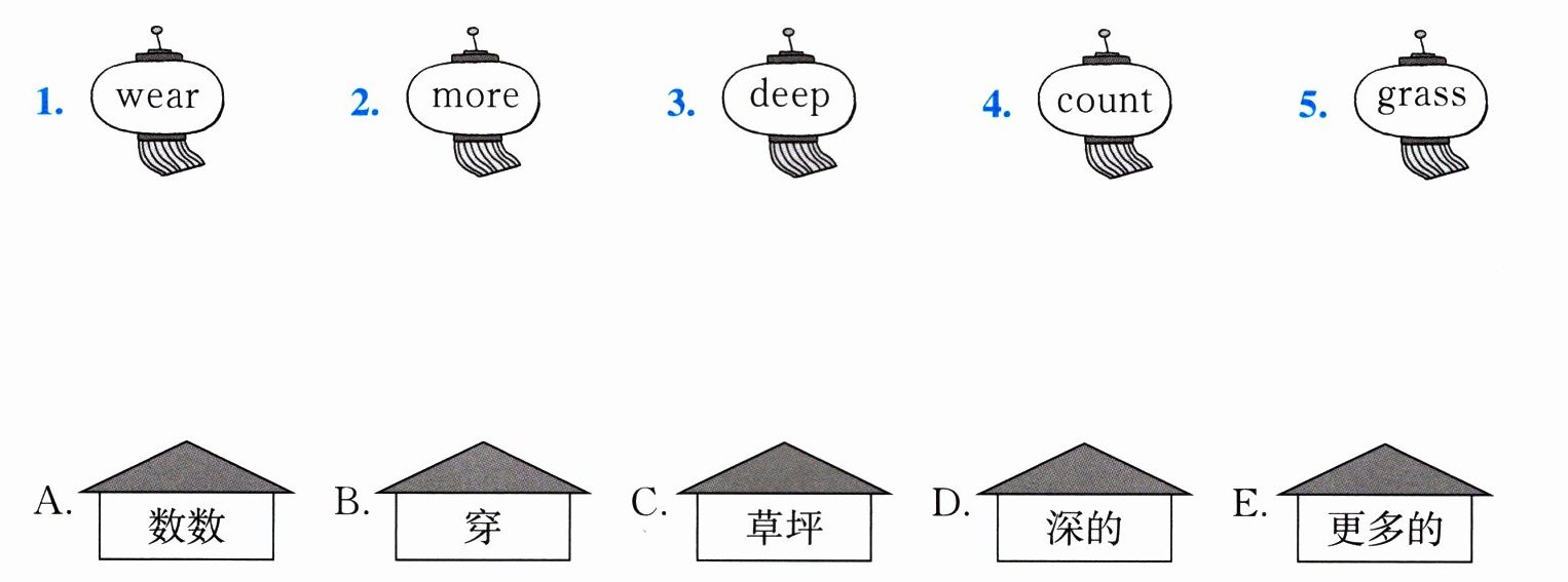 A. 数数 B. 穿 C. 草坪 D. 深的 E. 更多的