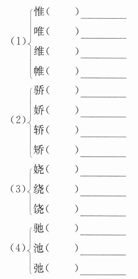(2)jiāo 骄傲 jiāo 娇艳 jiào 轿子 jiǎo 矫正