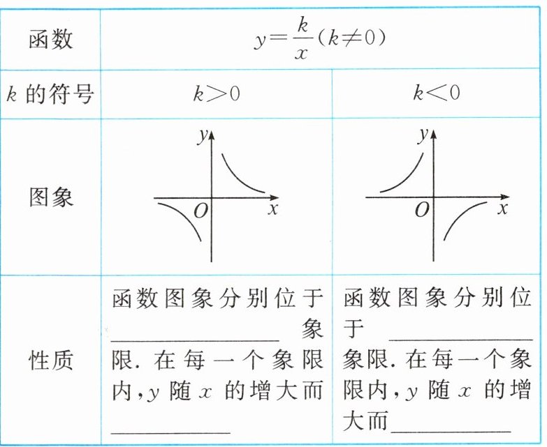 |性质|函数图象分别位于______象限. 在每一个象限内,$ y $ 随 $ x $ 的增大而______|函数图象分别位于______象限. 在每一个象限内,$ y $ 随 $ x $ 的增大而______|