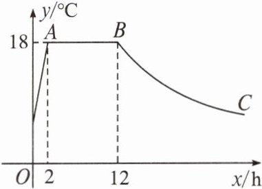 C 因为点$B(12,18)$在双曲线$y=\frac{k}{x}$上,所以$18=\frac{k}{12}$,解得$k=216$.当$x=16$时,$y=\frac{216}{16}=13.5$.所以当$x=16$时,大棚内的温度约为$13.5\ °C$.