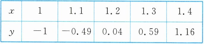 | $ x $ | $ 1 $ | $ 1.1 $ | $ 1.2 $ | $ 1.3 $ | $ 1.4 $ |