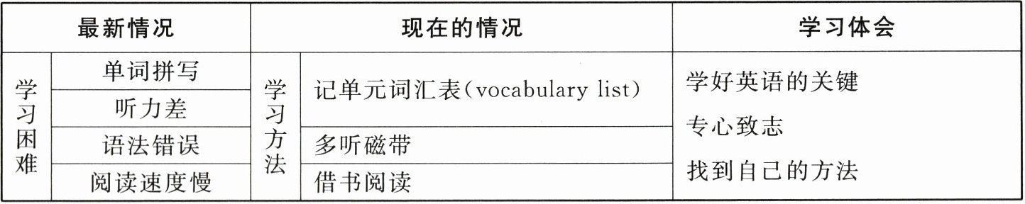假设你校要办一期英语墙报,交流学习英语的感受,请你按下面表格中的内容要点提示,写一篇题为“Find your own way to learn English”的稿件,介绍你学习英语的体会,要求80词左右。