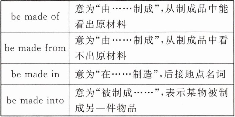 |be made of|意为“由……制成”,从制成品中能看出原材料|