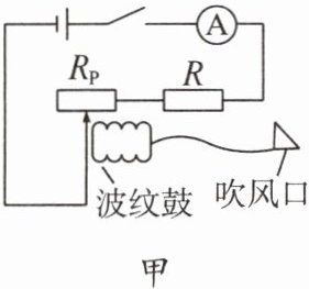 (1)由题图甲知,定值电阻R与滑动变阻器R_P串联,电流表测量电路中的电流,由题图乙知,不吹气时,滑动变阻器R_P接入电路的电阻为0,此时电路为定值电阻R的简单电路,根据欧姆定律可得此时电路中的电流为I=U/R=9 V/10 Ω=0.9 A。