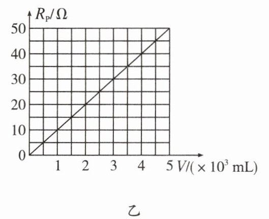 【对点训练4】某活动小组自制肺活量测试仪的原理图如图甲所示,人体吹出的气体使波纹鼓胀大,进而推动滑片$P$向左移动。图乙是滑动变阻器$R_{P}$接入电路的阻值与肺活量的关系图像,当测试仪测量最大肺活量为$5000mL$时,电流表的示数为$0.15A$。电源电压恒为$9V$,定值电阻$R为10\Omega$。求: