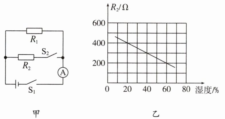 【例4】图甲为超声波加湿器内部湿度监测装置的简化电路图,图乙是传感器电阻$R_{2}$的阻值随湿度变化的图像。已知:电源电压保持不变,定值电阻$R_{1}= 200\Omega$。某次测量时,只闭合开关$S_{1}$,电流表的示数为$100mA$,再闭合开关$S_{2}$,电流表的示数为$200mA$。