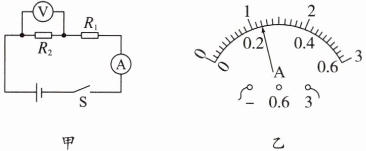 【例题】在学习了焦耳定律后,李明同学对电流做功和产生热量有了进一步的理解,如图甲,电源电压恒定不变$,R_1 = 10Ω,$开关S闭合,电压表的示数为6V,电流表的示数如图乙,则$R_2$的电阻为_________Ω。通电1min,电流通过$R_1$做的功为_________J。通电$1min,R_1$产生的热量为_________J。