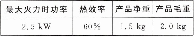 【对点训练 4】丁烷气炉是一种比较常见的家用燃气器具,使用方便、造型美观,因此深受广大消费者的喜爱。某品牌便携式丁烷气炉的相关参数如表所示。某次在标准大气压下用该燃气炉最大火力将锅内 25 ℃、2 kg 的水烧开,已知 $ q_{丁烷} = 5.0×10^7 J/kg $,$ c_{水} = 4.2×10^3 J/(kg·℃) $。