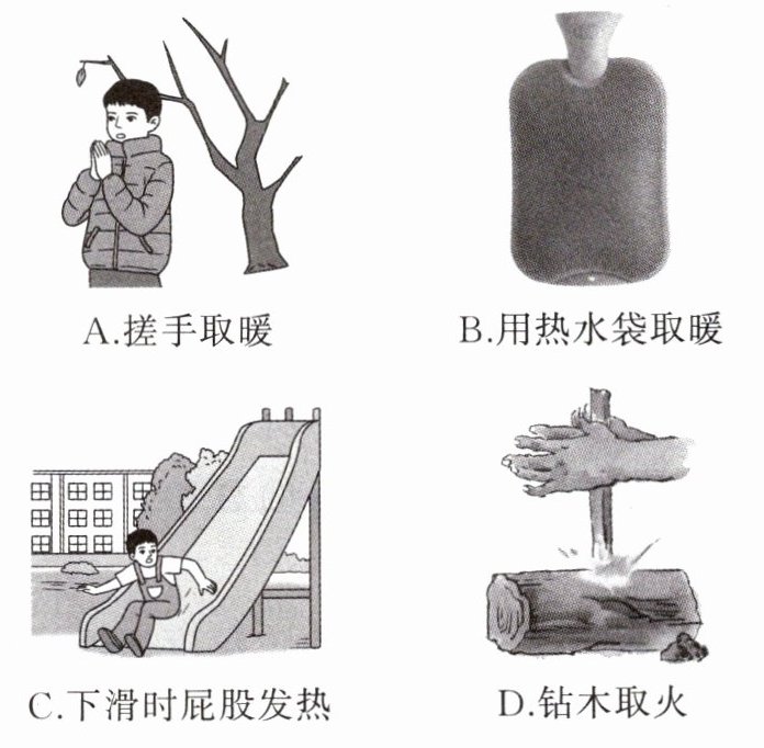 B 解析 搓手取暖、下滑时屁股发热、钻木取火都是克服摩擦力做功,机械能转化为内能;用热水袋取暖,是通过热传递的方式改变内能的。显然选项B与其他三个选项改变物体内能的方式不同。