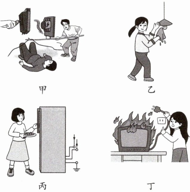 (1)有人触电时不能用手拉他, 应立刻切断电源或用干燥的木棒将人和电线分开。(2)生活用水是导体。(3)为了防止触电事故的发生, 家用电器的金属外壳要接地。(4)家庭用电器起火时, 我们应该先切断电源后灭火。