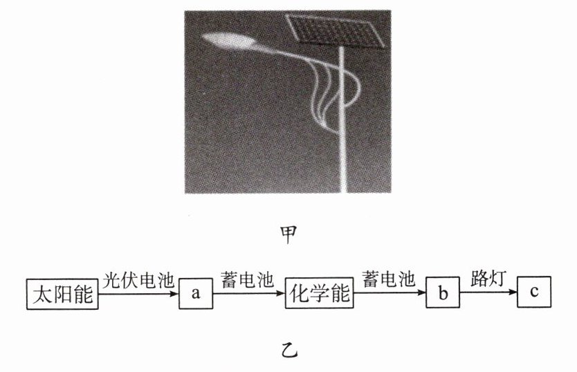 8. 如图甲所示的某路灯,白天光伏电池对蓄电池充电,晚上蓄电池对路灯供电,图乙是这一过程中的能量转化图(图中a、b、c分别表示某种形式的能量)。下列判断正确的是( )