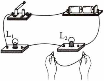 【例2】两个相同的小灯泡,单独接在两节干电池组成的电源两端,都能发光。当其连接成如图所示的电路时,闭合开关后,小灯泡$L_1$和$L_2$也都发光。用一根导线接在小灯泡$L_2$的两端,你会看到的现象是( )
