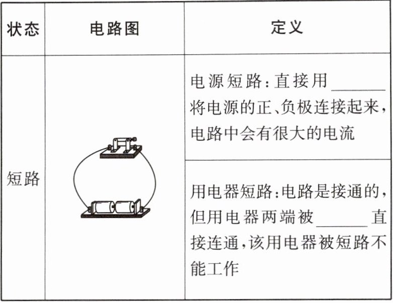 |短路||电源短路:直接用 ______ 将电源的正、负极连接起来,电路中会有很大的电流