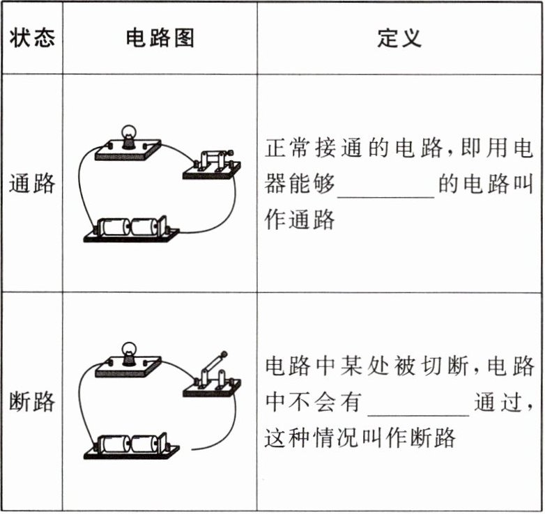 |通路||正常接通的电路,即用电器能够 ______ 的电路叫作通路|