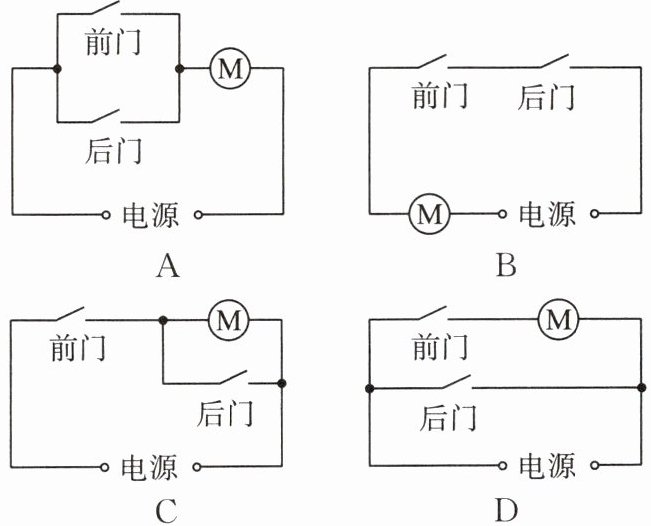 2. 电动公共汽车的动力来源于电动机,前、后两门(电路开关)中任意一个门没有关闭好,电动公共汽车都无法行驶。图中符合要求的电路是( )