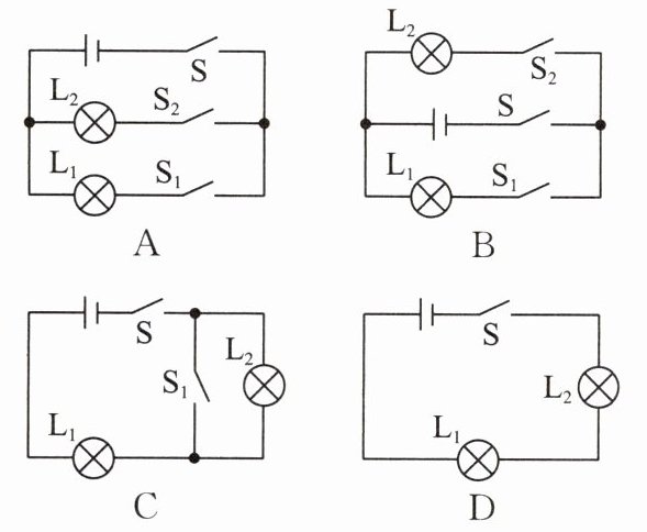 D 解析 由题图可知,闭合所有开关后,选项A、B电路中电流都有两条流通路径,属于并联电路。选项C电路中,L₂被短路,电路为L₁的简单电路。选项D电路中电流只有一条流通路径,属于串联电路。