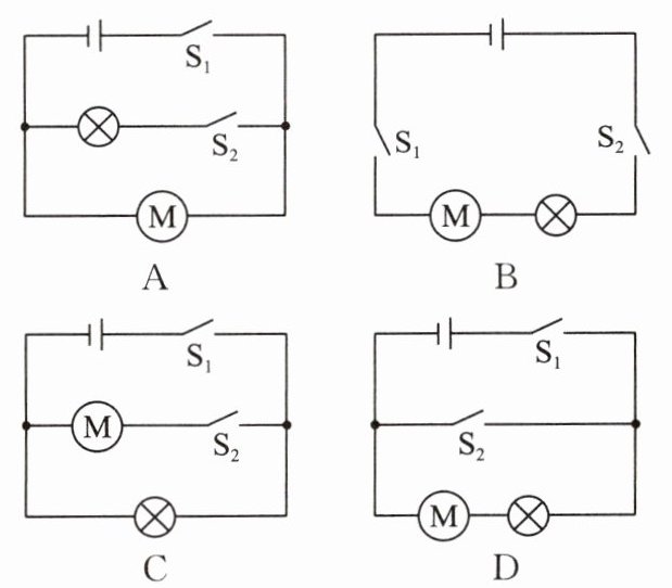 6. 无人机起飞时,先闭合开关 $ S_1 $ 指示灯亮起,再闭合开关 $ S_2 $ 电动机启动。下列电路设计符合要求的是( )