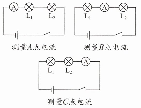 如图所示,在A、B、C三点接入____,分别测出不同位置的____,便能得到电路中电流的关系。