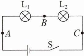 4. 小亮将灯泡$L_1、$$L_2$串联在电路中,如图所示,闭合开关S,他发现灯泡$L_1$比$L_2$更亮。他猜想可能是由于通过$L_1$的电流比通过$L_2$的电流大。为验证猜想,小亮进行了下面实验:他用电流表分别测量图中A、B、C三点的电流,电流表的示数均相同。由此说明:他的猜想是_________(选填“正确”或“错误”)的。通过实验得到串联电路中各点的电流处处相等的初步结论,为了使结论具有普遍性,接下来他的操作是_________。