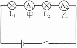 6. 在研究串联电路的电流的特点时,媛媛设计了如图所示的电路图,发现电流表甲和电流表乙的示数分别为0.24A和0.22A,为什么两个电流表示数不同呢?媛媛认为电流先到达电流表甲,经过灯$L_2$时电流被消耗了一部分,因此到达电流表乙时会小一些。你认为她的想法是_________(选填“正确”或“错误”)的,请你设计一种操作方法来验证你的观点:_________。