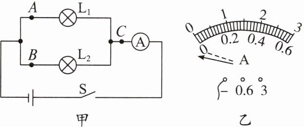 2. 如图甲所示,在探究并联电路中干路电流与各支路电流的关系的实验中,小明用电流表分别测出了A、B、C三处的电流,Iₐ = Iᵦ = 0.24 A,Iₑ = 0.48 A,下列说法正确的是( )