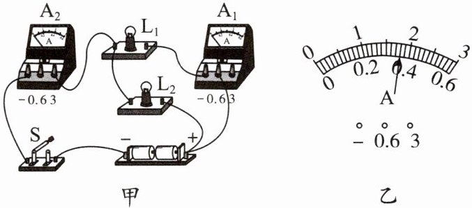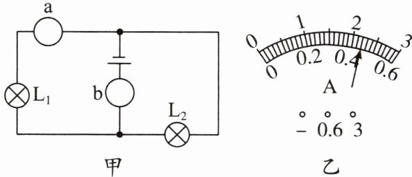 【例题】如图甲所示,a、b表均为电流表且接法正确。两表示数偏转如图乙所示,则$L_1$和$L_2$的电流分别是( )