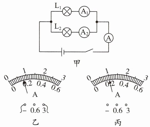 7. 在探究并联电路电流规律的实验中,小明按如图甲所示的电路图连接好电路后,闭合开关,电流表$A_1$的示数如图乙所示;电流表$A_2$和A的指针都指向同一刻度如图丙所示,则$L_1$中的电流为_________$A,L_2$中的电流为_________A,干路中的电流为_________A,由此初步得出并联电路中电流的规律为_________。