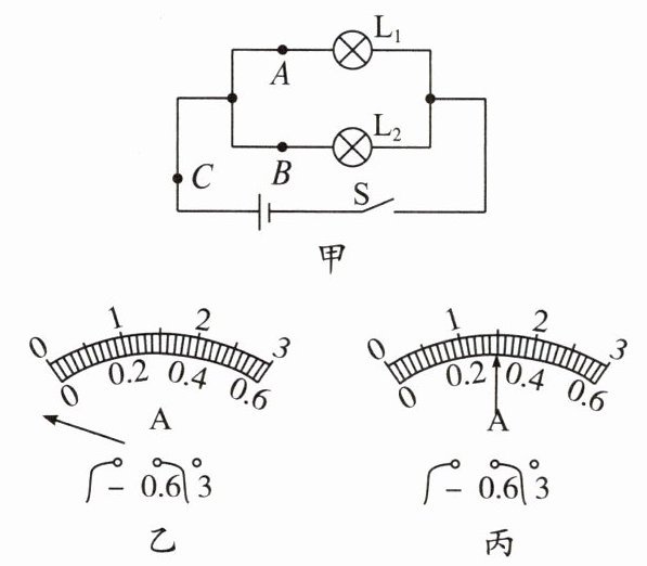 (1)电流表应____(选填“串联”或“并联”)在被测电路中。若要测量干路电流,则电流表应接在图甲中的____(选填“A”“B”或“C”)处。