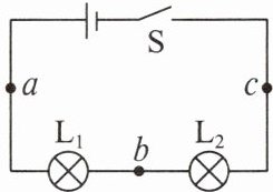 【对点训练】小明利用两个规格不同的小灯泡,设计了如图所示的电路,同时探究串联电路中的电流和电压规律,在某组实验中,测出了$a$、$b$、$c$三点的电流,以及$ab$、$bc$、$ac$间的电压,下列说法正确的是( )