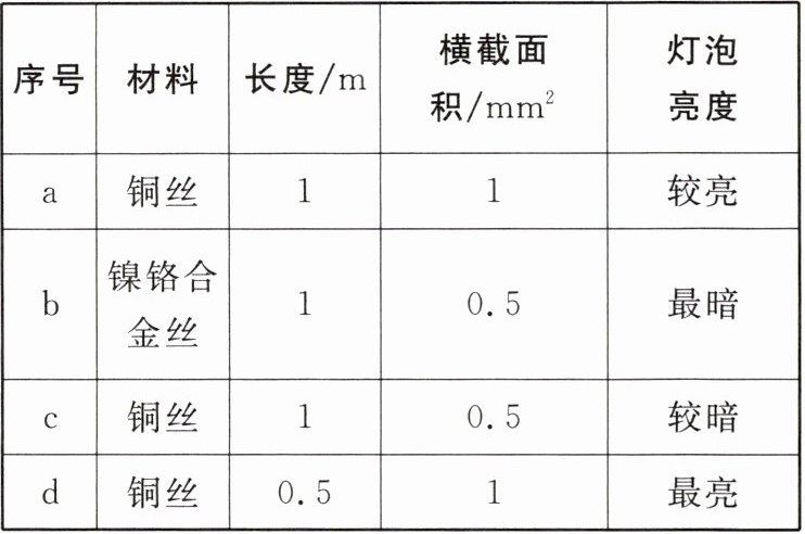 |序号|材料|长度/m|横截面积$/mm^2$|灯泡亮度|
