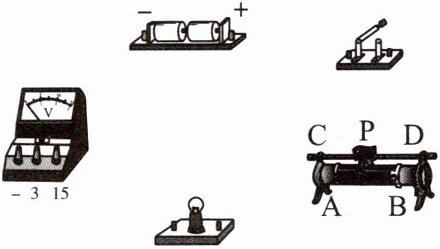5. 在用滑动变阻器改变小灯泡的亮度的实验课上,老师给出的实验器材如图所示。闭合开关后,将滑片$P$向右滑动时,小灯泡变亮,连入电路中的接线柱应是( )
