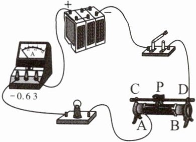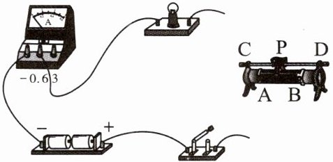 (3) 闭合开关,要使灯泡的亮度变亮,应将滑片$P向A$(选填“$A$”或“$B$”)端移动;滑片$P$移至图中所示位置,发现灯泡发光,但电流表的指针偏转幅度很小,原因是电流表的量程选择过大。