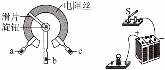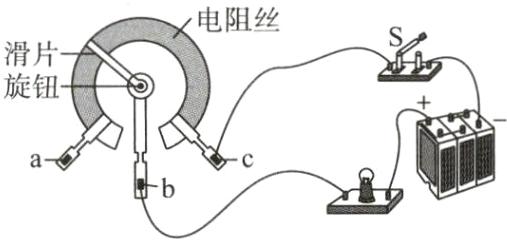 10. 某同学设计的模拟可调光台灯电路如图所示,其中电位器有$a$、$b$、$c$三个接线柱,请连接电路,使顺时针旋转滑片时灯泡变亮。