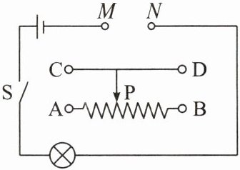 6. 如图所示,若要使滑动变阻器的滑片$P$向左端滑动时,小灯泡变亮,那么可以将滑动变阻器的$C接线柱与M接线柱接在电路的M$、$N$两端。闭合开关前,滑片$P应位于B$(选填“$A$”或“$B$”)端。