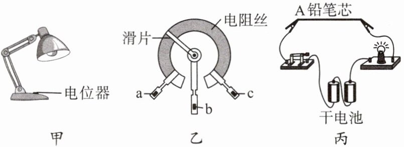 丙:简易调光台灯电路,A铅笔芯、干电池、开关、灯泡
