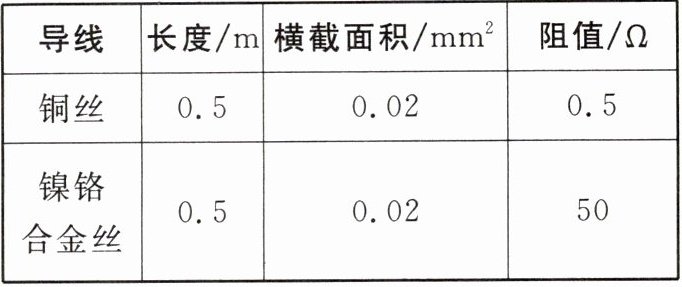 |导线|长度/m|横截面积$/mm^2$|阻值/Ω|