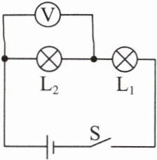 C 解析 由题图知,两灯泡串联,电压表测量$L_{2}$两端的电压;若$L_{1}$断路,电压表的正、负接线柱接不到电源正、负极上,电压表无示数,不符合题意,选项 A 错误;若$L_{1}$短路,$L_{2}$还亮,不符合题意,选项 B 错误;若$L_{2}$断路,两灯泡都不亮,电压表的正、负接线柱与电源正、负极是连通的,电压表有示数,符合题意,选项 C 正确;若$L_{2}$短路,$L_{1}$还亮,电压表测量导线两端的电压,示数为0,不符合题意,选项 D 错误。