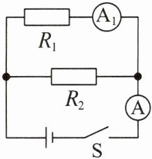 【例2】如图所示的电路,电源电压不变,电流表$A的示数为0.4A$,电流表$A_1的示数为0.3A$,电阻$R_1的阻值为10\Omega$。