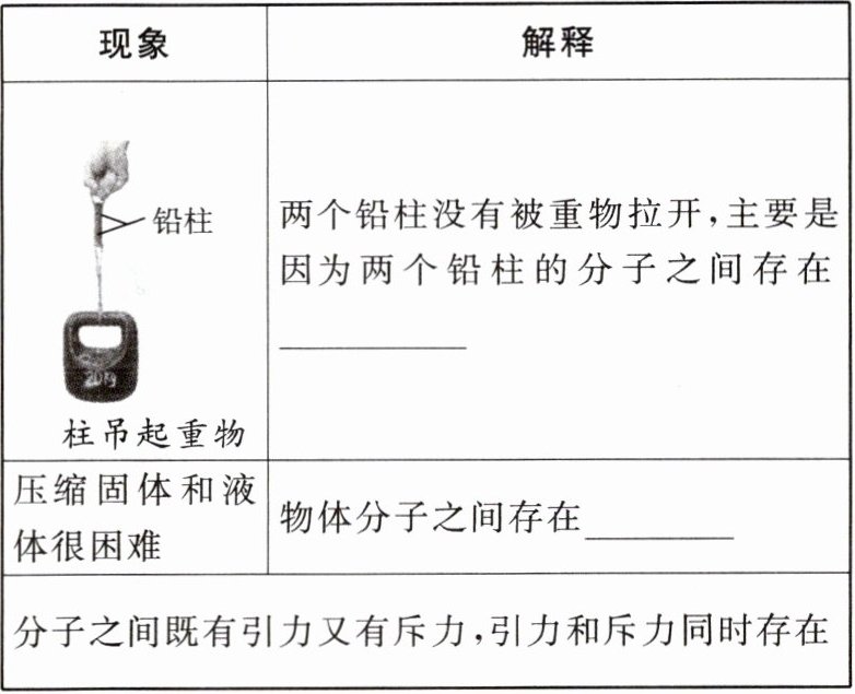 | 铅柱吊起重物:两个铅柱没有被重物拉开 | 主要是因为两个铅柱的分子之间存在____ |
