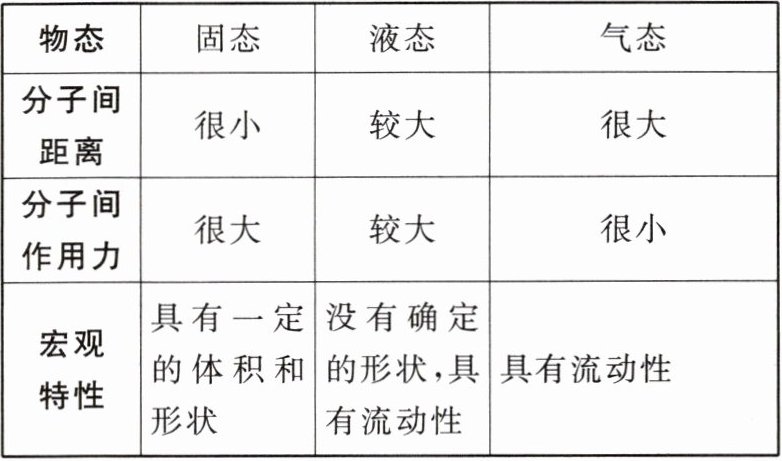 | 物态 | 分子间距离 | 分子间作用力 | 宏观特性 |