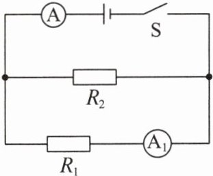 (1)由题图可知,$R_{1}$与$R_{2}$并联,电流表 A 测干路电流,电流表$A_{1}$测通过电阻$R_{1}$的电流。根据并联电路各支路两端的电压相等可知,$U_{1}=U_{2}=U=6\ V$,