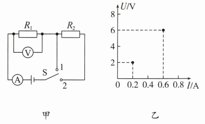 11. 在图甲所示的电路中,当开关$S从2转到1$时,根据电流表和电压表对应的示数,在$U-I$坐标系中描绘了相对应的坐标点,如图乙所示,求: