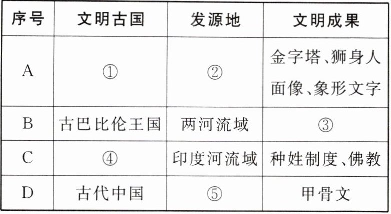 (1)图1封面上的建筑是金字塔和狮身人面像;图2封面上的文物是《汉谟拉比法典》石柱。应阅读图3中的书籍。(2)①古埃及;②尼罗河流域;③《汉谟拉比法典》;④古印度;⑤黄河流域、长江流域。