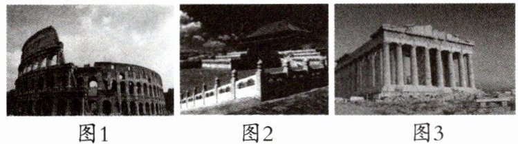 。(2)古代世界的建筑艺术可谓风格各异,请按建筑风格对上面三幅图片中的建筑进行分类。