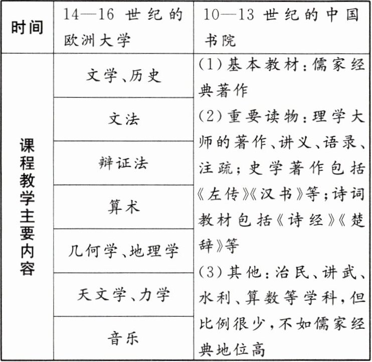 (3)差异:欧洲大学课程设置突出实用性,追求科学。中国书院课程设置内容单一,以儒家经典为主,侧重于伦理道德的教育。原因:①中国儒家思想和理学兴起的影响。②中国科举制的发展,文人阶层的兴起。③西方城市的发展和工商业的繁荣。