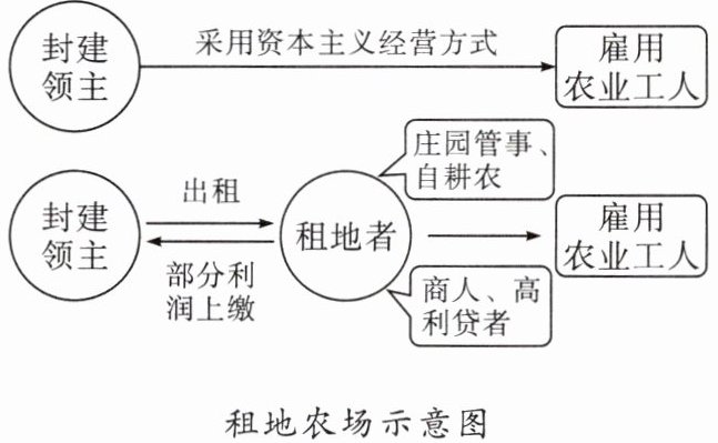 探究点一 提示 一部分庄园领主通过转让、联姻、继承、买卖等方式,将土地集中在一起,雇佣农业工人进行生产,这些人便由领主变为农场主。一些富裕农民通过承租、购买领主的土地,或者转租、购买其他佃户的地产等方式将土地集中起来,建立租地农场。他们采用新的生产方式进行经营,雇佣少地或无地的农民耕种,并将产品推向市场。