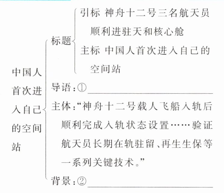 导语:6月17日9时22分,神舟十二号载人飞船在酒泉卫星发射中心发射升空,准确进入预定轨道,顺利将三名航天员送上太空。作用:概括了消息的主要内容。其中时间“6月17日9时22分”、人数“三名”体现了新闻的真实性,突出了新闻语言的准确性。“准确”“顺利”等形容词表现了我国航天技术的高超,突出了我国科技的新成就。