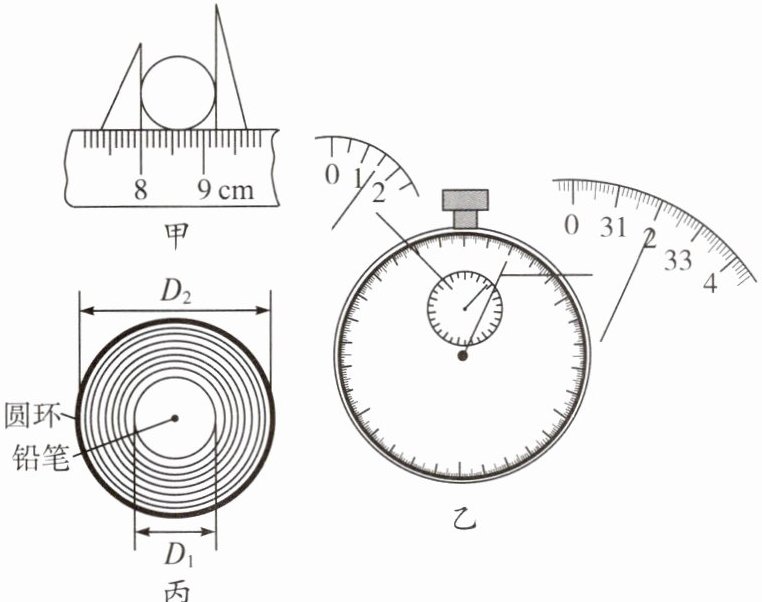 (3)一条纸带薄厚均匀,若把纸带紧密地环绕在圆柱形铅笔上,如图丙所示,纸带环绕了$ n $圈,则纸带的厚度是____(用$ D_1 $、$ D_2 和 n $的表达式表示)。