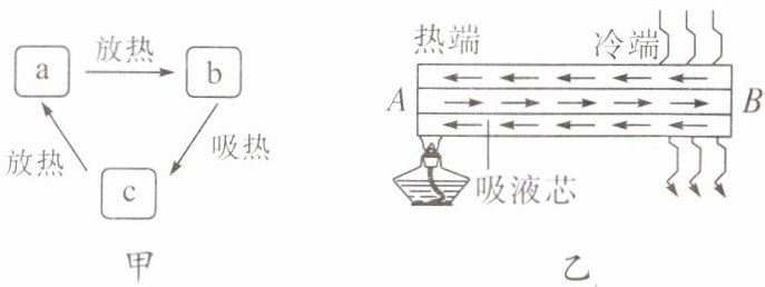 5. 固态的冰、液态的水和气态的水蒸气是水循环过程中水常见的三种状态,某同学据此画出了如图甲所示的水的三态变化图,a、b、c分别代表水的三种状态,则b是水蒸气(选填“冰”“水”或“水蒸气”);如图乙所示,“热管”是利用流体发生物态变化达到散热目的,被广泛应用于各种高端科技上,热管里的液体在A端吸热,然后流动到较冷的B端放热,B端通过散热风扇转动将热散出,则在B(选填“A”或“B”)端与图甲三个物态变化中由c(选填“a”“b”或“c”,下同)到a的物态变化形式相同。