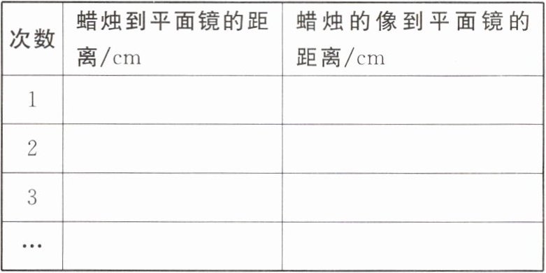 |次数|蜡烛到平面镜的距离/cm|蜡烛的像到平面镜的距离/cm|